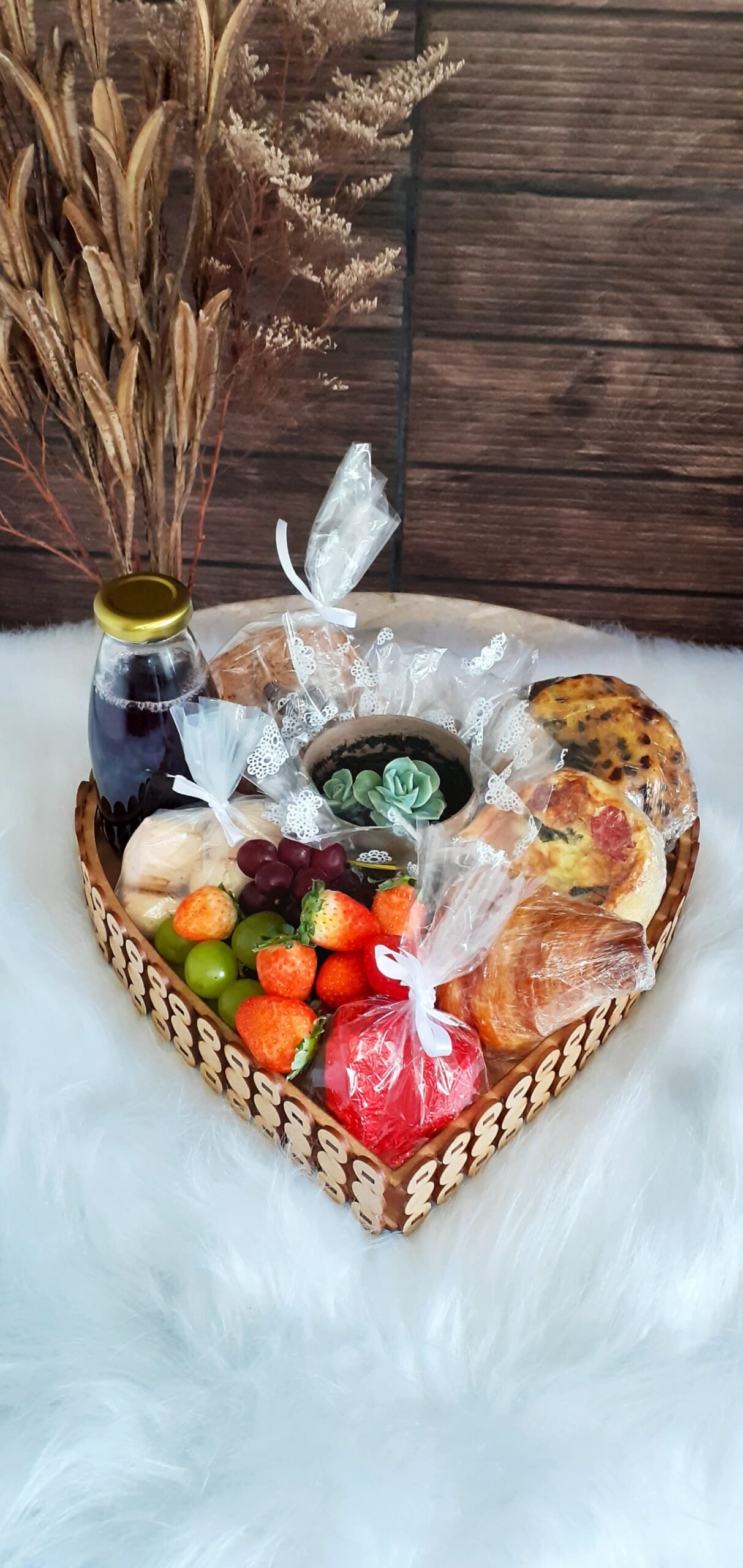 Além das delícias gastronômicas, esta cesta impressiona pela sua apresentação. Acompanha uma pequena suculenta, símbolo de delicadeza e longevidade, perfeito para trazer um toque especial ao presente. A cesta ainda vem embalada com papel celofane, um laço elegante, e inclui um cartão onde você pode expressar seus mais sinceros sentimentos. Tudo isso é cuidadosamente preparado dentro de uma charmosa caixa em formato de coração, tornando este presente ainda mais significativo e inesquecível para o Dia das Mães.